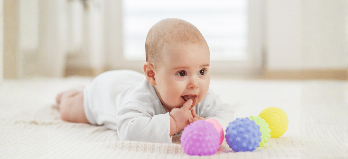Berguling dari perut ke punggung; meraih benda dengan satu tangan; menggenggam mainan. |