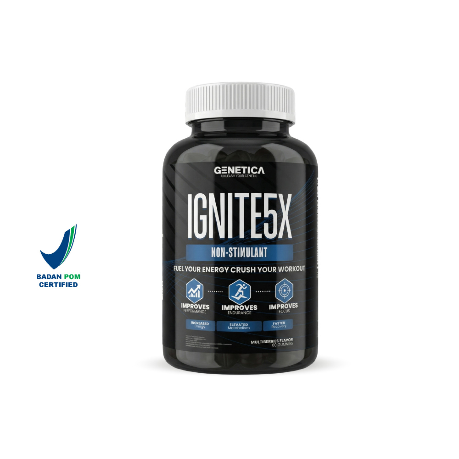 Genetica IGNITE5X adalah suplemen pre-workout inovatif dalam bentuk Gummy dengan rasa Multiberry yang praktis dan enak, tidak perlu shaker atau air.