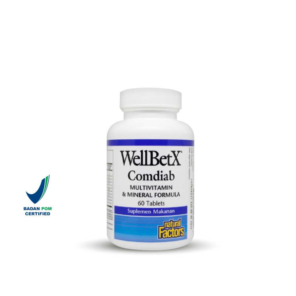 Natural Factors WellbetX Comdiab (Complete Diabetic) Multivitamin & Mineral Formula adalah suplemen kesehatan yang diformulasikan khusus untuk mendukung metabolisme glukosa yang baik. Dengan komposisi lengkap (multivitamin, mineral, dan kombinasi ekstrak herbal), suplemen diabetes ini akan bekerja secara sinergis membantu menormalkan kadar gula darah normal dan memelihara kesehatan tubuh secara umum.