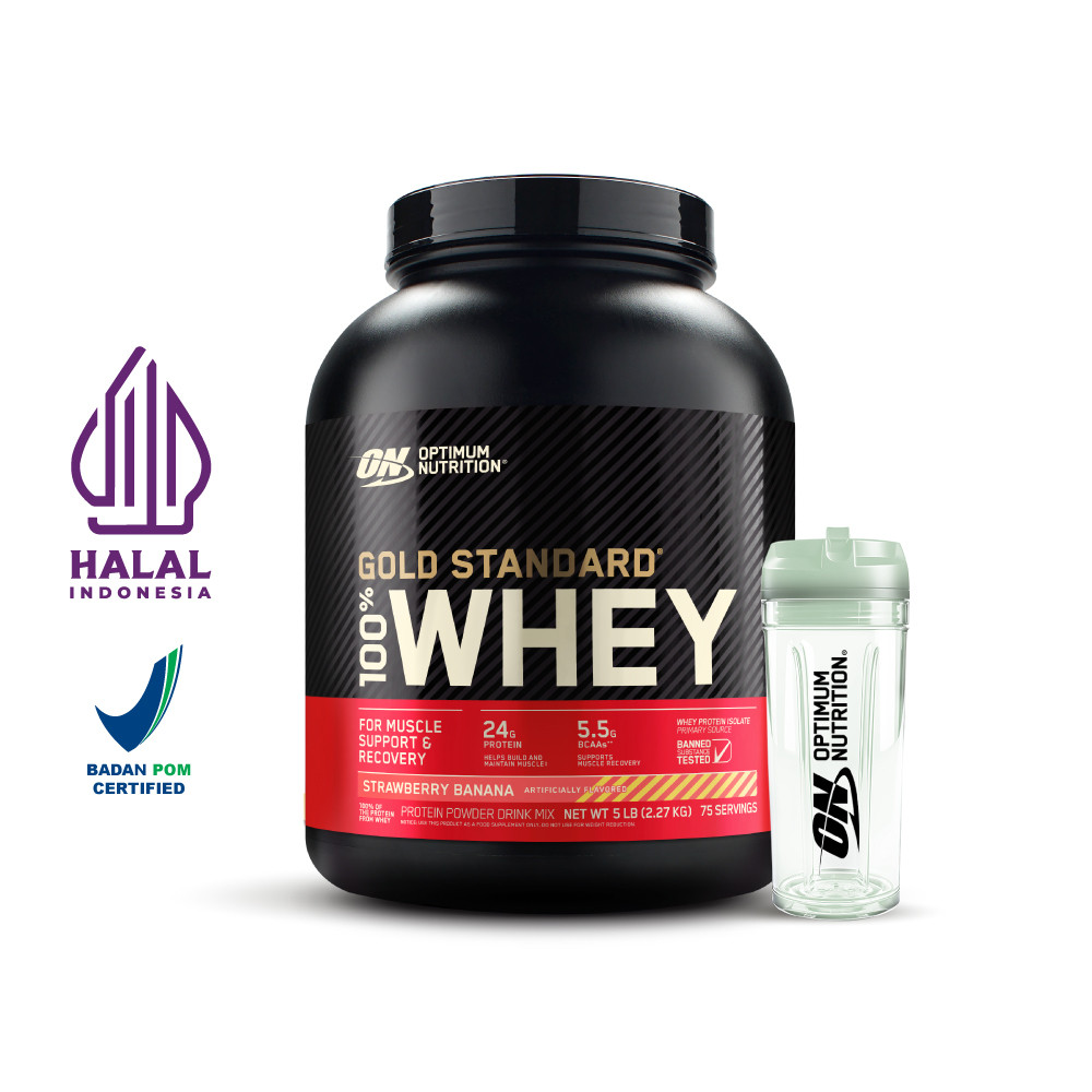 Optimum Nutrition Gold Standard 100% Whey mengandung 24 gram protein yang bersumber dari Whey Protein Isolate (WPI) merupakan bentuk paling murni dari protein whey, dikombinasi dengan Whey Protein Concentrate dan Hydrolized Whey Protein. Kandungan 5 gram BCAA berfungsi untuk membantu pembentukan massa otot dan membantu pemulihan sesudah latihan.